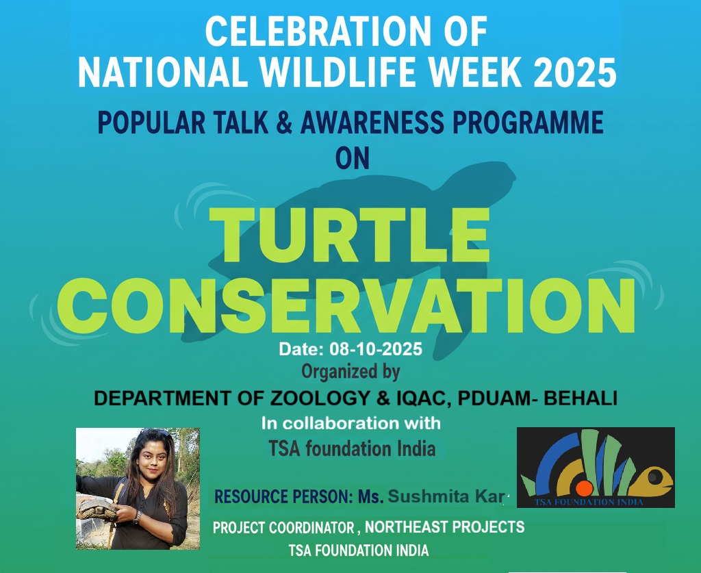 CELEBRATION OF NATIONAL WILDLIFE WEEK 2025 / Downloads, Events, News / By PDUAMB CELEBRATION OF NATIONAL WILDLIFE WEEK 2025 Department of Zoology & IQAC, PDUAM-Behali, in collaboration with TSA Foundation India, organized a Popular Talk-cum-Awareness Programme on “Turtle Conservation” as part of the celebration of National Wildlife Week 2025.